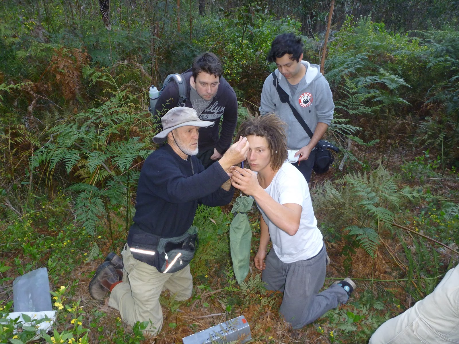 | Volunteers setting up the harp trap |