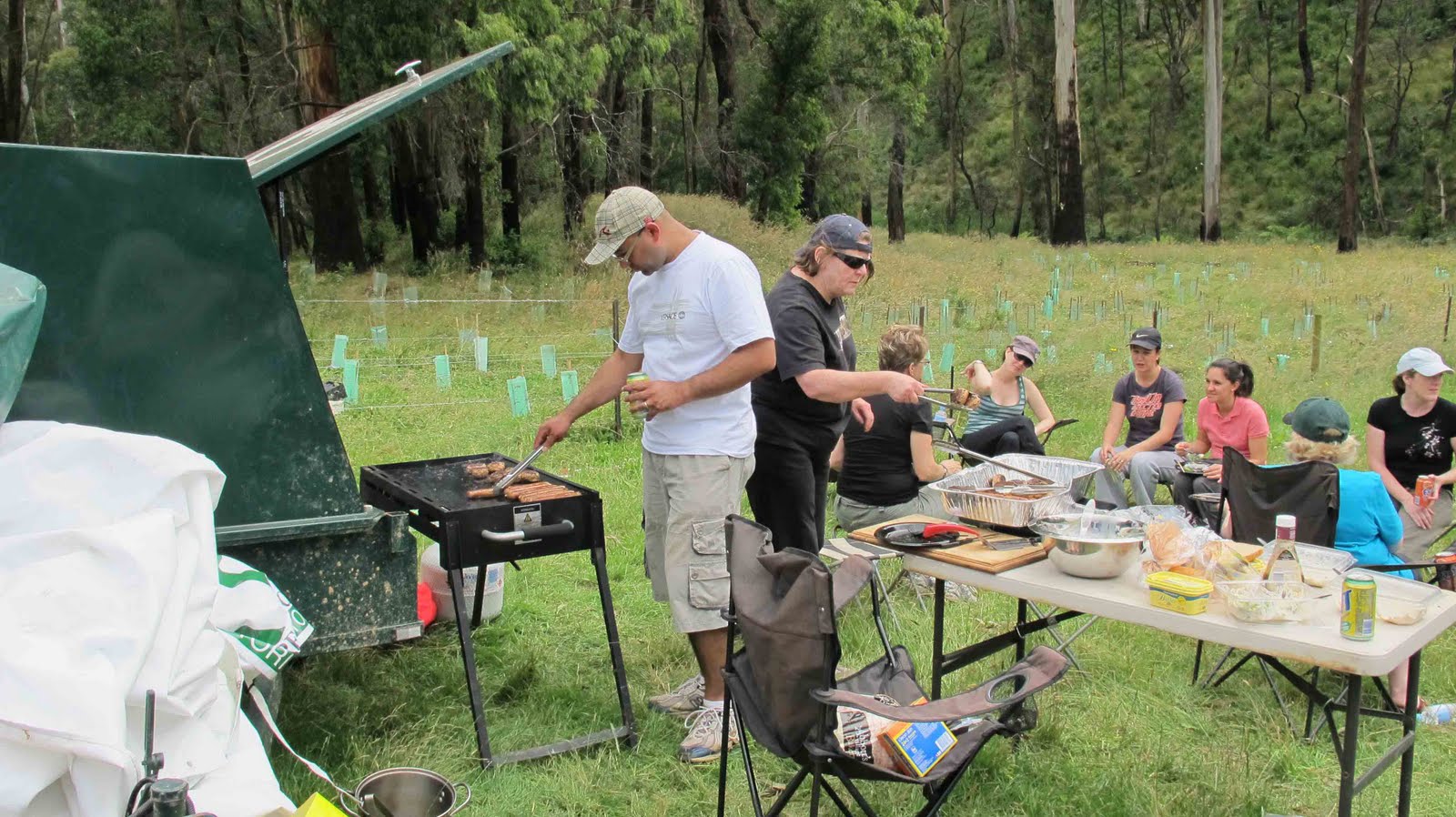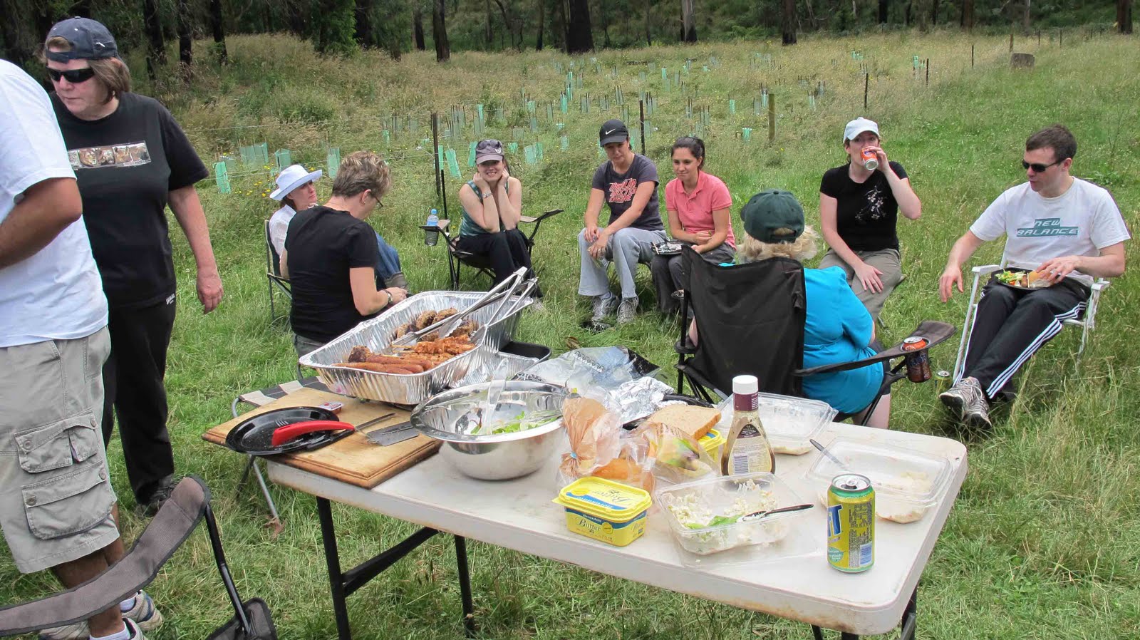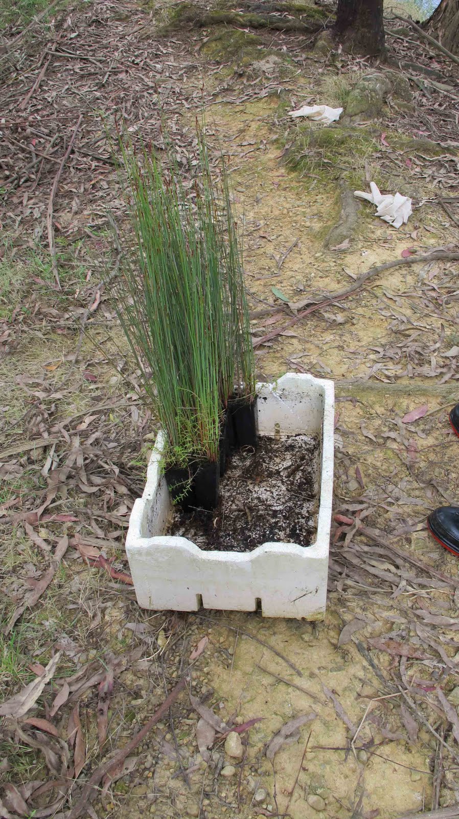 The BMS volunteers arrived on time and ready for action. Agility and flexibility were the skills required for planting around the dam without falling into the water. 200 water plants and 300 lands plants were added to the edges of the beautiful dams at Kinross Farm , improving the habitat value of the site. (Phil noted sacred kingfishers and gang gang cockatoos watching us work) A peaceful and productive morning was enjoyed by all the participants , who promised to return again next year. Their catering crew did and excellent job preparing a BBQ lunch before the rain set in again !