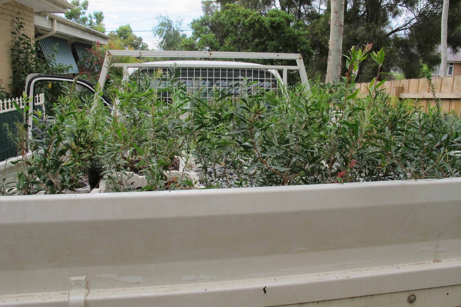 On Australia Day Janet & Justus made a quick trip to Melbourne to collect the last load of bottlebrushes and flowering gums from Mt Waverly . We missed Ron & Bevis but the plants were laid out for us in the backyard. We left them a thank you note and must remember to send a proper card from the bushfire recovery project in appreciation of their work .