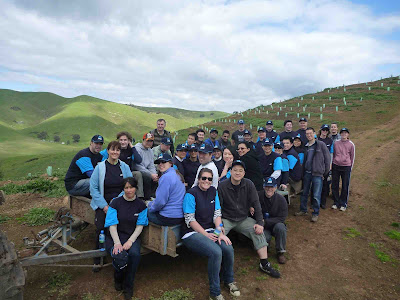 Volunteers arriving by the trailer load to Terry Hubbards planting site at Strath Creek .